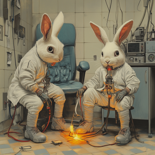 a scene where two rabbits dressed as people are on their knees trying to fix a wire that short-circuited and caused a fire. In the background, there is a 7-year-old boy sitting in an office (laboratory) chair, wearing an oversized scientist's lab coat and huge boots, looking a bit scared. His legs are bound and a gag is taped over his mouth, making him look frightened.