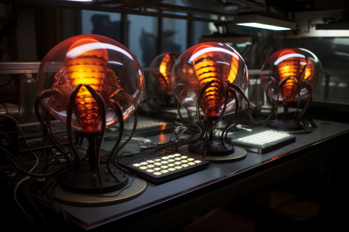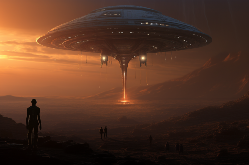 an old dusty closet filled with old alien technology, retro (1950s) aesthetics with futuristic technology, weapons, space suits and other items, packed in with too much, items, boxes, and unknown technology items