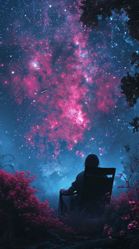 stars and galaxies in the sk, of an alien world, an alien is sitting in a chair looking up at the sky, in the style of anime aesthetic, dark pink and sky-blue --ar 9:16 --v 6.0 --s 250