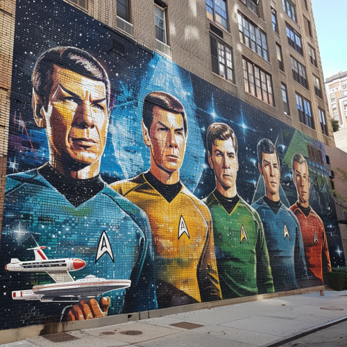 a mural on an long inner city brick wall depicting scenes from the tv series star trek, realistic --s 250