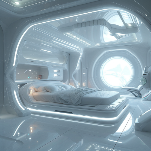 Futuristic white bed photo with the latest technology, alien technology --v 6.0 --s 300