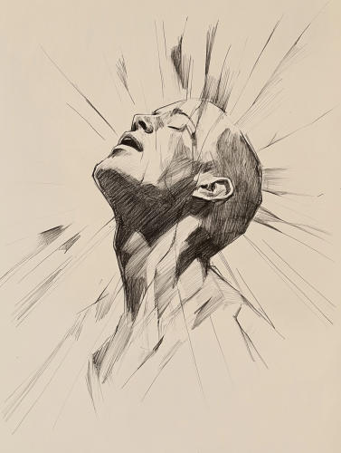 A rough, chaotic pencil sketch capturing the moment a figure feels fully alive, gazing upward towards the sky. The figure's posture is one of intense clarity and connection, with their head tilted back and eyes focused on the heavens. Sharp, dynamic lines radiate from the figure, symbolizing the heightened awareness and vitality of the moment. The sketch is rough and unrefined, with jagged, purposeful strokes that convey the raw, powerful sensation of being fully present and alive. The background is minimal, emphasizing the figure's connection to the sky and the profound sense of life coursing through them. --c 8 --ar 3:4 --v 6.1