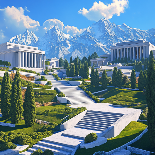 Roman inspired festival, modern building materials such as steel and glass, roman landscaping, italian cypress trees, white granite walkways, american football practice field, no stairs, only ramps, colorful tents, NFL themes,electronic signage, modern roman coliseum inspired stadium on mountain in background, waterfalls, late evening, rendered in minimal visual noise graphic style
