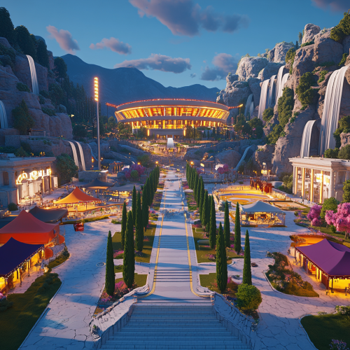 Roman inspired concert festival, modern building materials such as steel and glass, roman landscaping, italian cypress trees, white granite walkways, american football practice field, no stairs, only ramps, colorful tents, NFL themes,electronic signage, modern roman coliseum inspired stadium on mountain in background, waterfalls, late evening, rendered in style of Fortnite