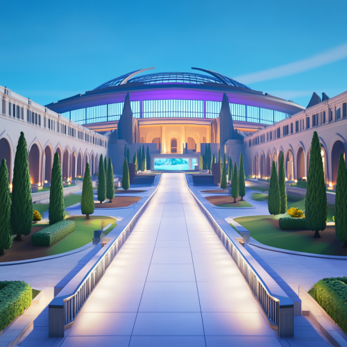Alt text: Modern stadium entrance with Roman landscaping and lighting.