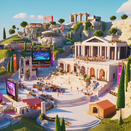 Roman inspired concert festival, modern building materials such as steel and glass, roman landscaping, italian cypress trees, white granite walkways, american football practice field, no stairs, only ramps, colorful tents, NFL themes,electronic signage, modern roman collegium inspired stadium on mountain in background, hillside, late afternoon, rendered in style of Fortnite