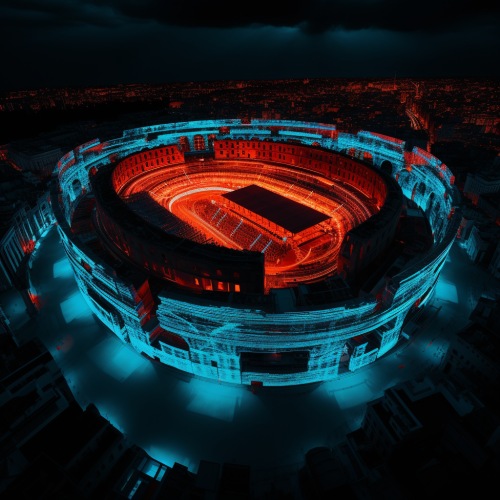 birds eye veiw of a futureistic roman colosseum stadium, half neon cyan other half neon red