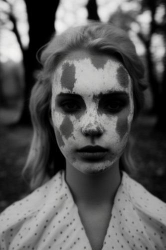 A black and white photo with scratches and peeling film emulsion, a pierrot from head to toe, in the woods, in the style of Francesca Woodman, film photography, fashion photography --ar 2:3 --v 4