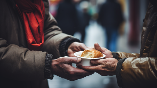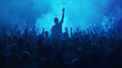 a realistic image of a crowd of people standing together, one person stands above the rest with their hand raised. dramatic navy and cyan lighting. --ar 16:9