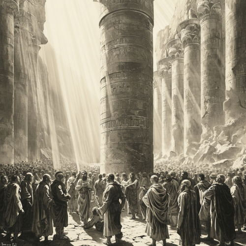 Crowds surrounding the huge pillar and looking at it in amazement --v 6.0
