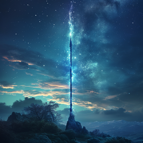 a magical spear created from stars, one of a kind,epic image,background a placid place --v 6.0