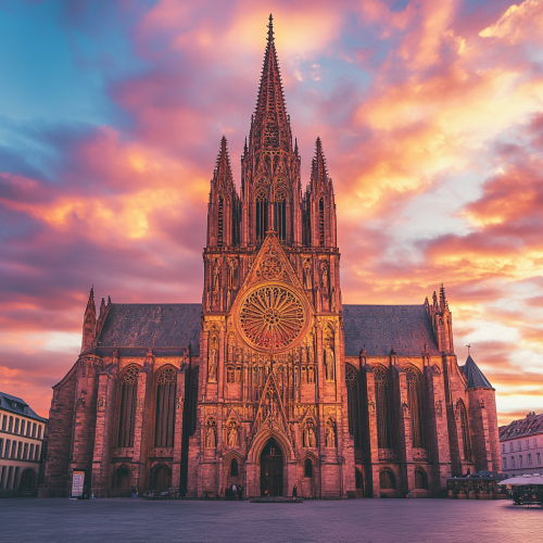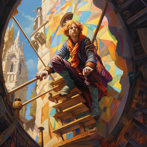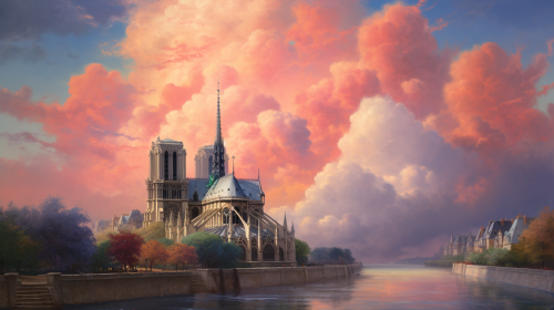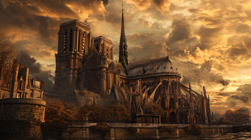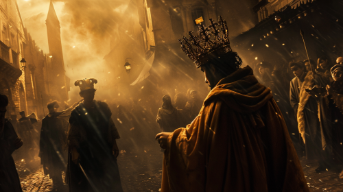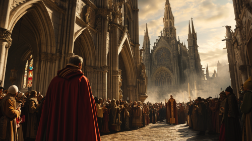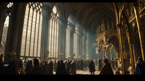 From the story Hunchback of Notre Dame, chapter 4, 1480's France, The interior of the Palace of Justice, focusing on its large, ornate windows and the crowd trying to view the play, Central Focus, Explosive Backdrop, Stormy Tranquility, Dramatic Horizon, Ephemeral Glow, Tempest Beauty, immersive foreground --ar 16:9 --v 6.0