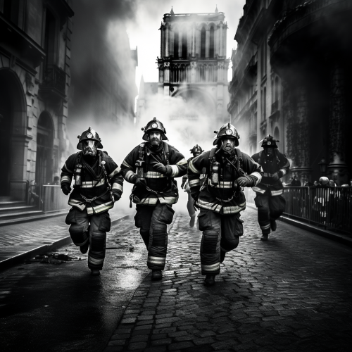 black and white photography of firefighters running and screaming next to burning notre dame. High contrast.
