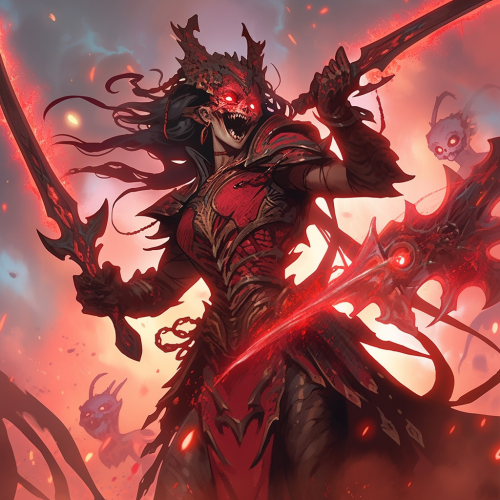 Grimdark mystic legendary omnipotent dame of broken hearts from Age of Sigmar wielding a huge vorpal knife, close-up view, anime style, high fantasy, digital art, masterpiece painting, ultra detailed, ultra high definition, 8K resolution, 3D shading, superior quality, cover illustration, complex design, luminous highlights, rich vibrant colours, hyperrealistic, meticulously hyper detailed, high contrast, artstation --niji 5