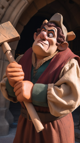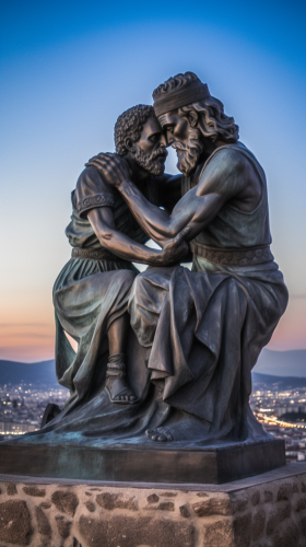 Hephaestus, an ugly God, looking like The Hunchback of Notre Dame with his beautiful wife Aphrodite, 8k, Athens city in the background --ar 9:16 --v 5.0