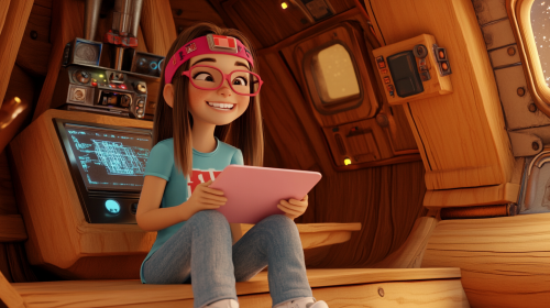 Inside a cozy wooden treehouse-turned-spaceship, Bryanna, a 8-year-old girl with straight brown hair, a band hairstyle, red and white squares headband, pink glasses, and a slightly chubby build, is sitting comfortably on a wooden bench. She is holding a a pink tablet with a big grin on her face. Bryanna is wearing a light blue t-shirt, light blue jeans, and white sneakers. Her bright brown eyes are filled with excitement as she reflects on the space adventure they've just had. The background includes the simple wooden walls of the treehouse, with a glowing metallic command console nearby. The style is 3D render --ar 16:9