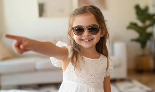 An 8-year-old girl in white dress and sunglasses, with blurred city background, in hyper-realistic photo with natural light.