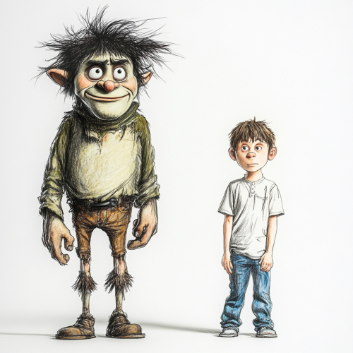 a funny-looking drawing of a troll in the style of Jeff Kinney, next to a drawing of a kid 8 years old. They are both the same height. White background