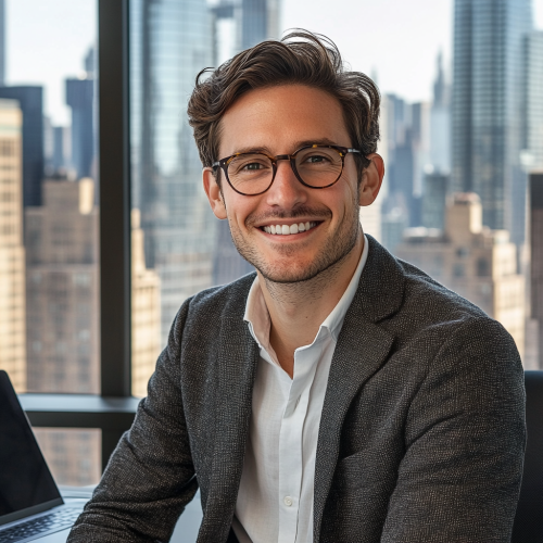 Create a hyper-realistic photo of a handsome 33-year-old personal finance writer with British roots, living in New York. He has short brown hair, light stubble, and wears glasses. He’s dressed in a charcoal gray blazer over a white shirt, seated in a modern office with large windows showing the New York skyline. The desk has a laptop and documents. The photo is taken with an iPhone 15 camera in UHD quality, highlighting his smile and professional, approachable demeanor, perfect for LinkedIn posts and magazines in 2024.