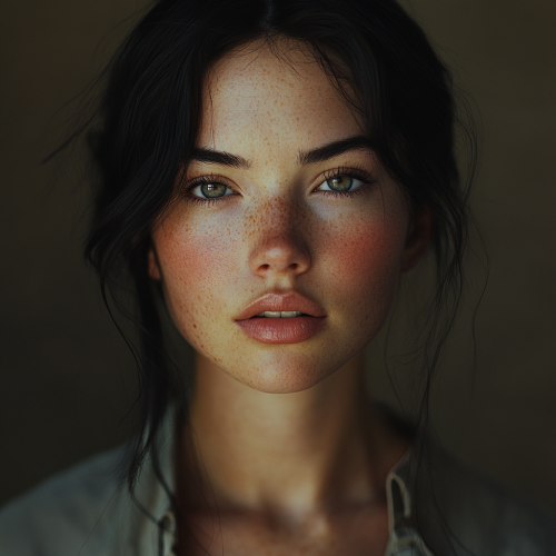 A hyper-realistic photograph of a 28-year-old woman with black hair, medium build, shown from head to toe, standing confidently and making direct eye contact with the camera. The woman has Caucasian features, with fair skin showing natural textures like pores and subtle freckles, soft waves in her hair, and minimal makeup. The lighting is natural and diffused, highlighting her skin and creating gentle shadows that enhance the realism, Canon EOS R5, 85mm lens, f/2.8 aperture, ultra-HD quality, detailed textures --style raw