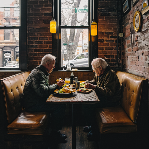 a realistic photo taken over the shoulder of a 37 year old man sitting down for breakfast with his 75 year old friend. The 75 year old man is eating an omelet. the 37 year old is eating avocado toast. They are sitting in a corner booth with a table made of wood.