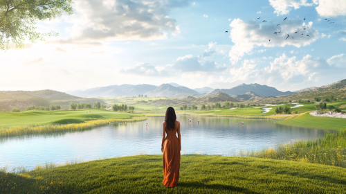 generate a hyper realistic full picture of a brown lady, 30 years old, medium body size, 165 cm tall, hair should be long and soft hairstyle, wearing a long dress, walking on green grass, with her back to the camera, kids playing from a distance, golf courses from a distance, mountains in the background, crystal clear blue lakes, sunny day, soft light, clear weather, luxury style, birds in the sky, shot with a sony a 9, 8k, --v 6.1 --ar 16:9