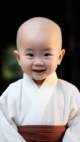 Chinese style festival background, a 2-year-old super cute Chinese monk, without hair, wearing a white printed monk uniform, with tender skin, round face, facial close-up, exquisite facial features, happiness, super realistic skin details, visible pores, character portraits, portrait photography, Canon R5, shutter speed 1/200, aperture F/5.6, ISO100, high-end presentation, very realistic colors, Rembrandt light, Bright screen, light background, 32K ultra high definition, ultra realistic style --ar 9:16