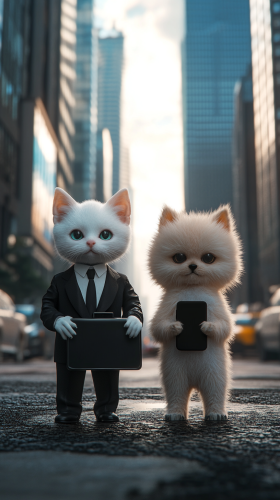 A highly detailed and cinematic scene captured in 8K resolution. In the heart of a bustling city, surrounded by tall skyscrapers and busy streets, a small white Persian kitten named Komuri and a fluffy 30-day-old Pomeranian puppy named Bomuri are standing confidently. Both are dressed in sleek, black suits that contrast with their soft, fluffy fur. Bomuri, holding a black briefcase in one paw, stands with a serious expression, while Komuri, holding a smartphone in one paw, is looking at the screen with focus. The background showcases the modern cityscape with tall glass buildings, busy traffic, and people walking by, all blurred slightly to keep the focus on the two characters. The lighting is bright and natural, reflecting off the glass buildings and casting dynamic shadows. The atmosphere is professional yet slightly whimsical, as the two small animals look like they’re on a serious mission amidst the urban environment. Parameters: Camera: IMAX laser camera Style: Hyper-realistic, cinematic, bright and dynamic lighting, 8K detail, urban and professional atmosphere --ar 9:16