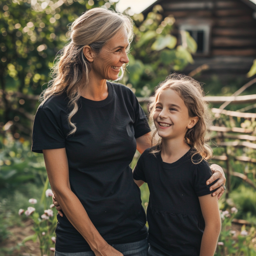 Plain black t-shirt mock-up, smiling and happy 36 old woman wearing a totally plain black t-shirt, standing front on, playing with her 8 year old daughter, farmyard background, lots of natural sunlight, photo realistic --v 6.0
