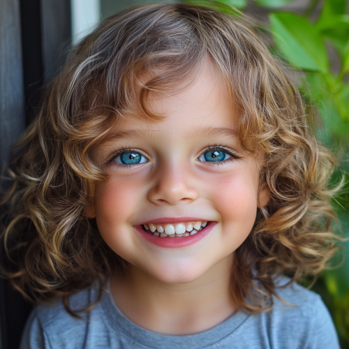 Take a photo of a 5-year-old white child, with darker blue-green eyes and dark blonde and curly hair. This child is a girl and is smiling for the photo. His hair is long. His teeth are a little small and are a little spaced apart.