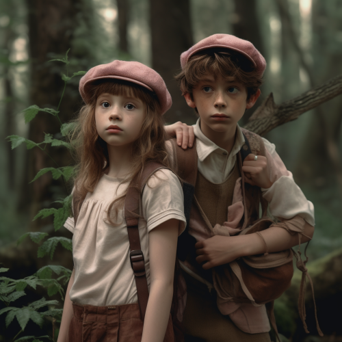 Create a hyper-realistic live-action photograph of a young boy and girl standing together in a dark, mysterious forest with twisted roots and vines in the background. The boy is wearing a light brown cap, white long-sleeve shirt rolled up at the elbows, and a brown vest. He has short, slightly messy hair. The girl is wearing a light pink puff-sleeve dress with a blue belt, and a red headband in her short hair. The boy is on the left, holding the girl’s hand firmly with both of them slightly facing forward but looking to the right. The girl is on the right, and her hand is held tightly by the boy. Both have concerned expressions with slight dirt marks on their faces and clothes. The background should be a dark, dense forest with thick, gnarled roots and vines surrounding them, adding a sense of mystery and tension. The exact pose and positioning of the characters must match the reference image, with the boy’s left arm extending forward while holding the girl’s right hand. --v 5.1