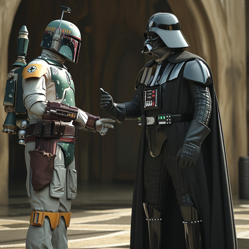 Imposing as ever, Darth Vader, now Chief of the Galactic Police, confers with his trusted ally, Officer Boba Fett, 3D, caricatured style:: --version 6.0