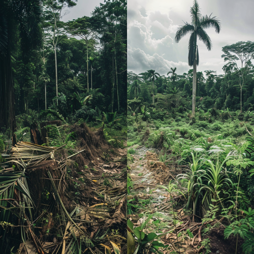 a dense jungle on the left and the right side of the jungle has been cut down to stumps --v 6.0