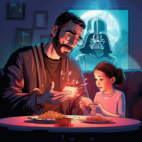a father watches star wars on his phone sitting at the dinner table while his 6 year old daughter watches youtube on a big screen tv . Cartoon style.