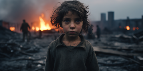 It is war. A frightened child is looking into the camera, burning ruins in the background, photograph, hasselblad 55 mm, --ar 2:1