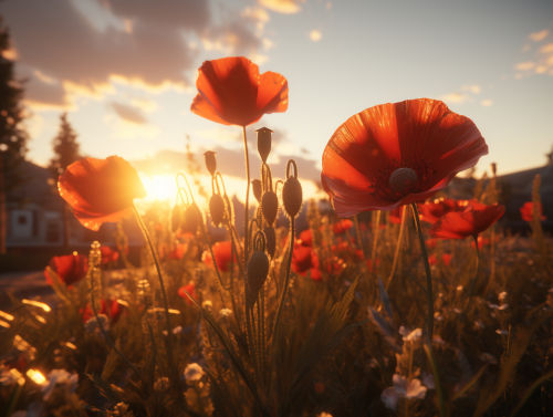 In Flanders fields the poppies blow Between the crosses, row on row, That mark our place; and in the sky The larks, still bravely singing, fly Scarce heard amid the guns below. We are the Dead. Short days ago We lived, felt dawn, saw sunset glow, Loved and were loved, and now we lie, In Flanders fields. Take up our quarrel with the foe: To you from failing hands we throw The torch; be yours to hold it high. If ye break faith with us who die We shall not sleep, though poppies grow In Flanders fields. ::1 ultra-realistic mega-defined 64k::1 --chaos 40 --ar 4:3