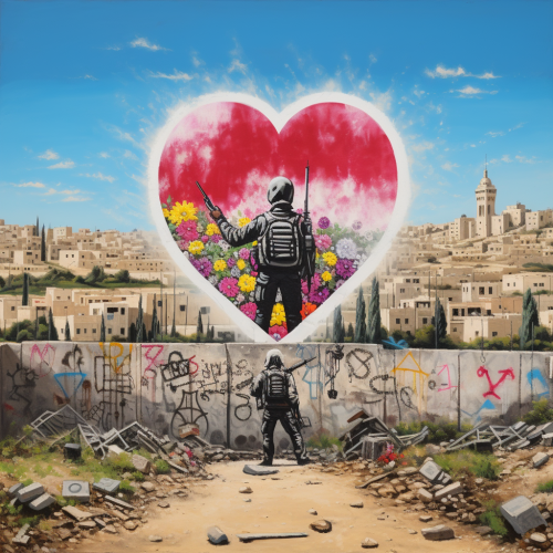 an ultra realistic image of an street wall painted with street art by Bansky with an paint to reflect over the israel war using the Maguén David, heart simbols and Peace sign