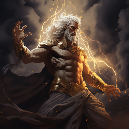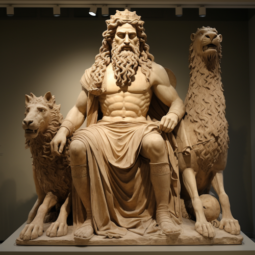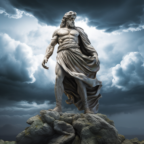Create an ultra-realistic, high-definition image of an ancient Greek philosopher. The philosopher should be depicted as a white marble statue, aged with cracks and discoloration. The statue stands in a powerful stance atop a hill. The background features a dramatic sky with lightning striking.