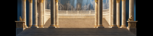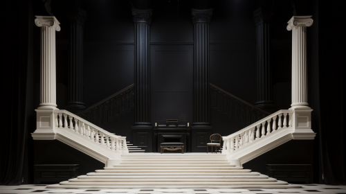 Generate a scenography in frontal plane, with Greek architectural columns, that the columns are seen from the front. In the center a staircase --ar 21:5