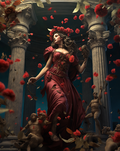 Greek goddess Persephone dressed in ancient Athens clothes, surrounded by columns decorated with red flowers and pomegranates while dancing among the souls of the deceased --ar 4:5