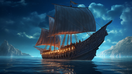 an ancient Greek ship taken from behind sails in the middle of the infinite ocean in the middle of the night, in the background the Pacific Ocean in the middle of the night --no land --ar 16:9