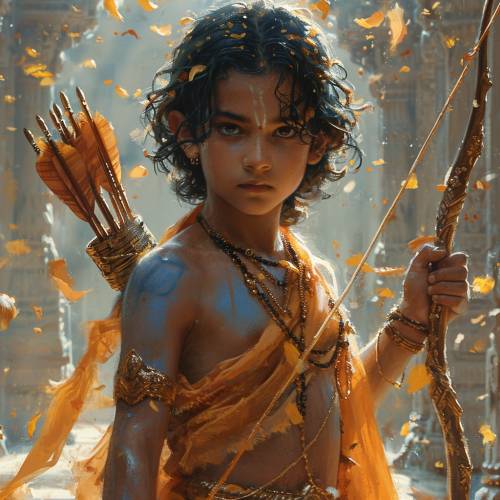 ancient, handsome, charming 15 year old boy hindu Prince Rama with blue complexion, black hair, large confident eyes and determined face, in traditional ancient silk hindu clothes stands holding a bow and arrow on the floor of grand ancient Hindu palace, flower petals swirling everywhere, sunlit, as drawing drawn with lit matches, in the style of full length portraiture, golden light, light gray, happy poses, smokey background, light orange and light black, light & shadow --stylize 750 --v 6.0