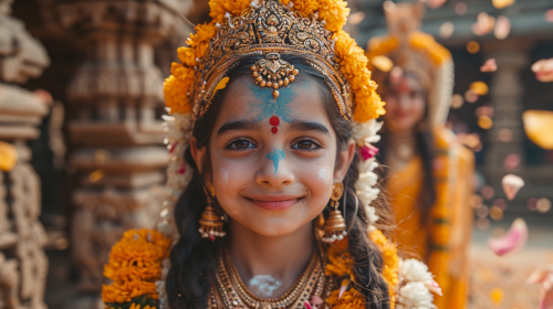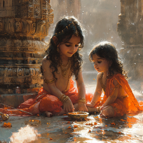 masterpiece low angle foot level shot of ancient, handsome, charming 15 year old blue-skinned boy hindu Prince Rama smiling and holding hands breathtaking beautiful 13 year old girl hindu princess Sita at to the entrance of a grand Hindu temple with rock carvings, black hair, beautiful eyes and smiling face in traditional ancient silk hindu clothes stands holding a bow, petals swirling everywhere, sunlit, as drawing drawn with lit matches, in the style of full body full length portraiture, golden light, light gray, happy poses, smokey background, light orange and light black, light & shadow --ar 16:9 --stylize 750 --v 6.0