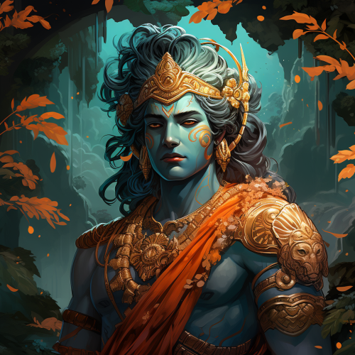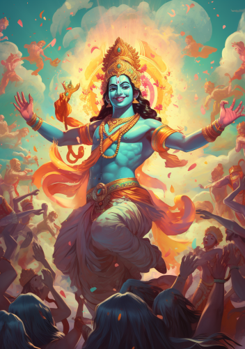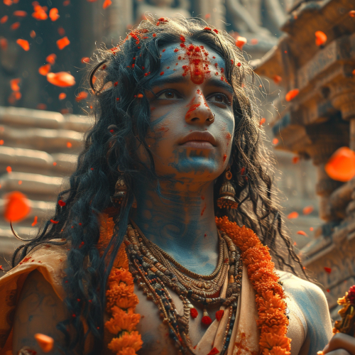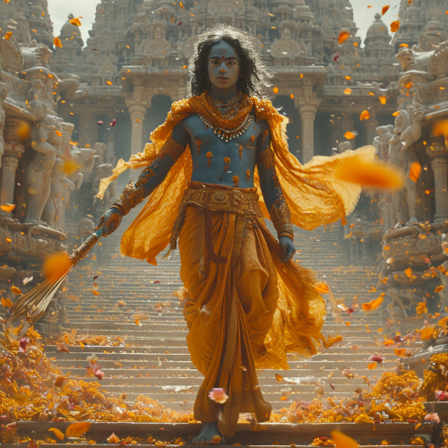masterpiece low angle foot level shot of ancient, handsome, charming 15 year old blue-skinned boy hindu Prince Rama, climbing stairs to a grand Hindu temple with rock carvings, black hair, beautiful eyes and smiling face in traditional ancient silk hindu clothes stands holding a bow, petals swirling everywhere, sunlit, as drawing drawn with colored light, in the style of full body full length portraiture, golden light, light gray, happy poses, smokey background, light orange and light black, light & shadow --stylize 750 --v 6.0