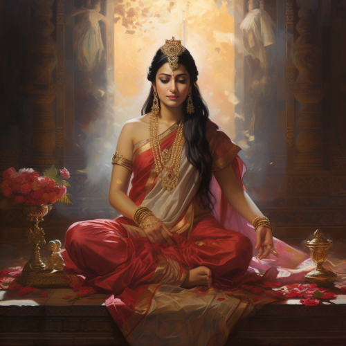 Generate a vivid and culturally respectful description of Hindu Lord Rama and Sita standing in a divine temple setting. Capture the sacred atmosphere, intricate details of their divine attire, the spiritual aura surrounding them, and the architectural beauty of the temple. Include elements that convey the reverence and devotion associated with the worship of Lord Rama and Sita in Hindu tradition.