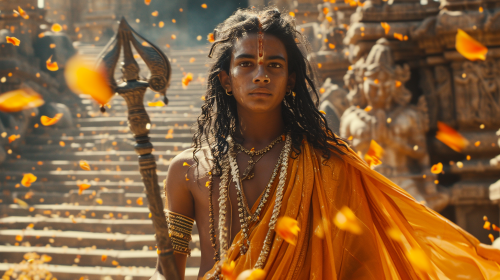stunning low angle shot of ancient, handsome, charming 15 year old boy hindu Prince Rama with blue complexion, black hair, large confident eyes and determined face, in traditional ancient silk hindu clothes stands holding a metal bow climbing up the stairs of a grand ancient Hindu temple with rock carvings, flower petals swirling everywhere, sunlit, as drawing drawn with lit matches, in the style of full length portraiture, golden light, light gray, happy poses, dynamic angles, smokey background, light orange and light black, light & shadow --stylize 750 --v 6.0 --ar 16:9