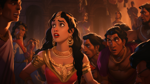 front facing picture of Lord Shri Ram and Sita walking in the palace where Sita is looking at Ram, surrounded by forts and trees with Laxman following them