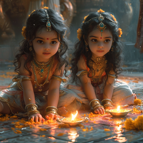 ancient, handsome, adorable little toddler hindu Prince Rama in traditional ancient silk hindu clothes crawling on the floor of grand ancient Hindu temple, as drawing drawn with lit matches were cute, in the style of portraiture, golden light, light gray, happy poses, smokey background, light orange and light black, light & shadow --stylize 750 --v 6.0