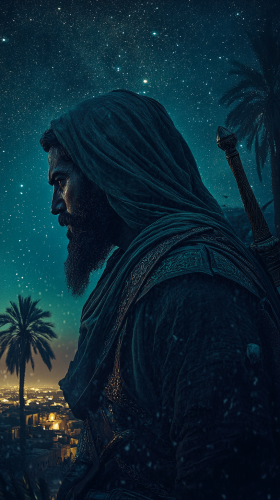 a strong arabian warrior with a long beard looking out into the distance, with a sword, his head is covered with a dark green scarf, in a night time scene with stars in the night, with a silhouette of ancient city lights and palm trees --ar 9:16