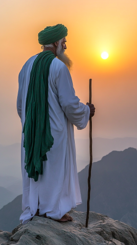 an old age arabian man standing on a mountain, wearing traditional robes in white and green, with a green turban, long beard, masculine physique, holding a stick and staring towards the right, with his back facing to us, the time is around sunset --ar 9:16